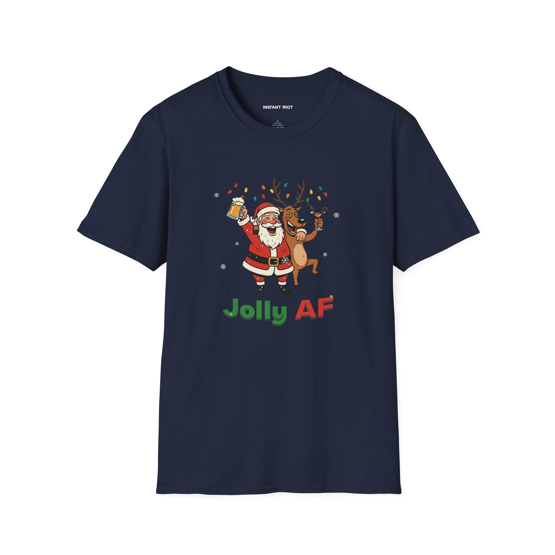 Get lit like the tree with our “Jolly AF” Santa and reindeer holiday shirt. Perfect for ugly sweater parties (without the sweater), Christmas Eve shenanigans, or just spreading questionable cheer at family gatherings. Whether you're toasting with friends or spiking the eggnog, this shirt brings the party.